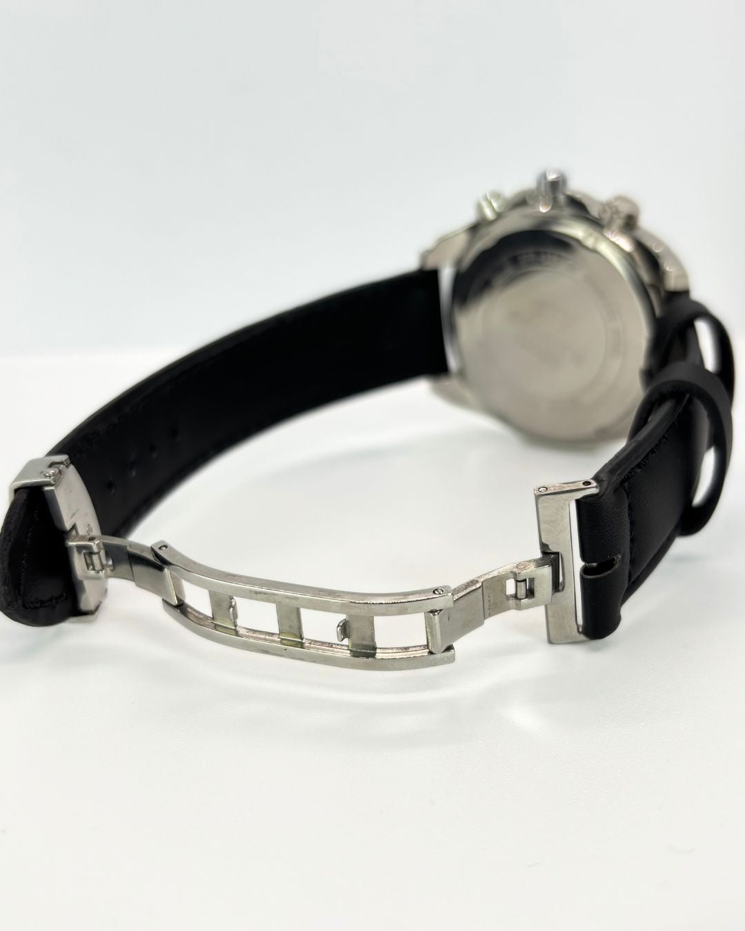 A bold chronograph watch featuring a large dial, stainless steel case, and genuine black leather strap, with date display and luminous hands, it's the perfect mix of style and performance for everyday wear.